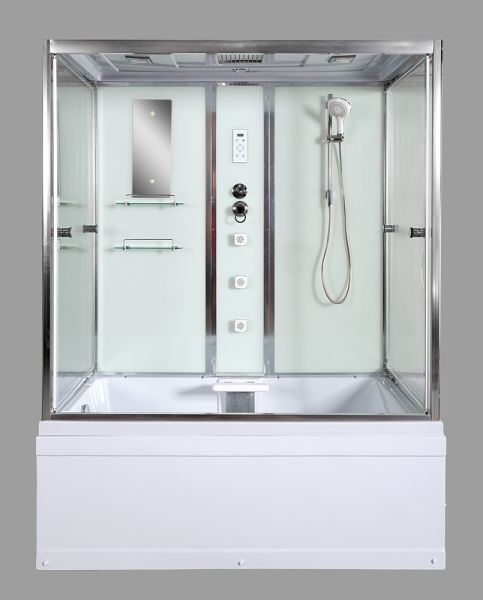 Стильная душевая кабина с внутренней сборкой AvaCan V150 сочетает в себе высокую функциональность, практичность и надежность. Для изготовления применяют безопасное закаленное стекло толщиной 5 мм, надежно фиксируемое алюминиевым профилем. Цвет профиля хром. В комплекте зеркало, сенсорный пульт управления, гидромассажные форсунки, смеситель, переключатель режимов, вентиляция, радио.