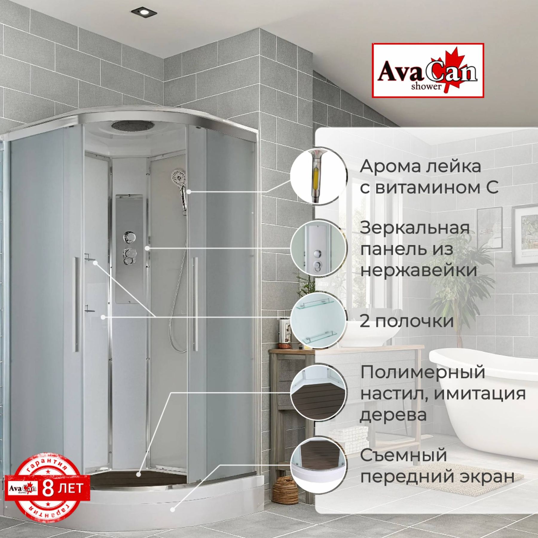 Стильная душевая кабина AvaCan EM2090 сочетает в себе высокую функциональность, практичность и надежность. При изготовлении применяется безопасное закаленное стекло толщиной 5 мм (матовое), надежно фиксируемое алюминиевым профилем. Сборка без силикона (увеличивает срок службы), внутренняя сборка(облегчает установку и ревизию; позволяет установить в ограниченном пространстве), смеситель резьбовой (без хомутов). Съемный экран поддона (позволяет осуществлять ревизию сифона). Цвет профиля хром. Двойные металлические ролики дверей (увеличивают срок службы).В комплекте : душевая штанга, две полочки , тропический (верхний) душ, арома-лейка с витамином С (картридж съемный),полимерная вставка в поддон(имитация дерева),сифон, ручки дверей из нержавейки , двойные ролики .