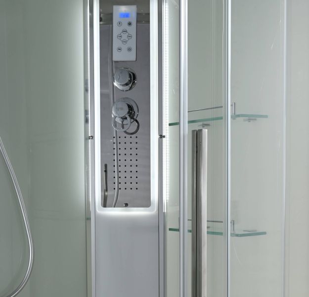 Стильная душевая кабина AvaCan EM2811RLEDT сочетает в себе высокую функциональность, практичность и надежность. При изготовлении применяется безопасное закаленное стекло толщиной 5 мм (прозрачное), надежно фиксируемое алюминиевым профилем. Сборка без силикона (увеличивает срок службы), внутренняя сборка(облегчает установку и ревизию; позволяет установить в ограниченном пространстве), смеситель резьбовой (без хомутов). Съемный экран поддона (позволяет осуществлять ревизию сифона). Цвет профиля  хром. Двойные металлические ролики дверей (увеличивают срок службы).В комплекте : душевая штанга, две полочки , тропический (верхний) душ, арома-лейка с витамином С (картридж съемный),полимерная вставка в поддон(имитация дерева),сифон, ручки дверей из нержавейки , двойные ролики ,пульт сенсорный(Блютуз ,LED подсветка ,радио ,вытяжка),гидромассаж спины.