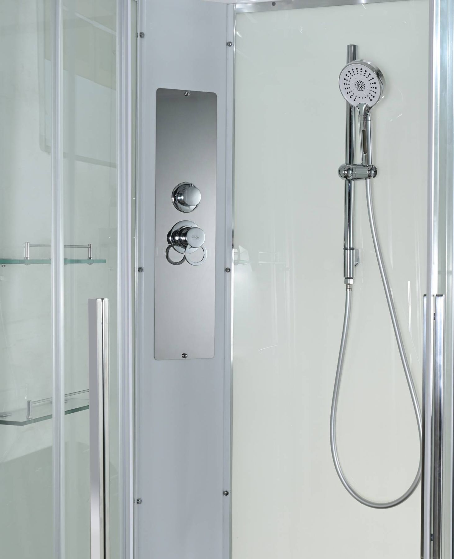 Стильная душевая кабина AvaCan сочетает в себе высокую функциональность, практичность и надежность. При изготовлении применяется безопасное закаленное стекло, надежно фиксируемое алюминиевым профилем. Профиль сделан из алюминия повышенной прочности. Сборка без силикона (увеличивает срок службы, защищает от протечек), внутренняя сборка (облегчает установку и ревизию; позволяет установить в ограниченном пространстве и обойтись без демонтажа других сантехнических приборов), смеситель резьбовой (без хомутов). Съемный экран поддона (позволяет осуществлять подключение и ревизию сифона).Двойные металлические ролики дверей (распределение нагрузки на два ролика, увеличивают срок службы). Душевая штанга(позволяет регулировать по высоте ручную лейку), ручная арома-лейка с витамином С (картридж в комплекте,есть возможность замены или удаления картриджа), полочки(из стекла, с ограничителем), сифон с гидрозатвором.