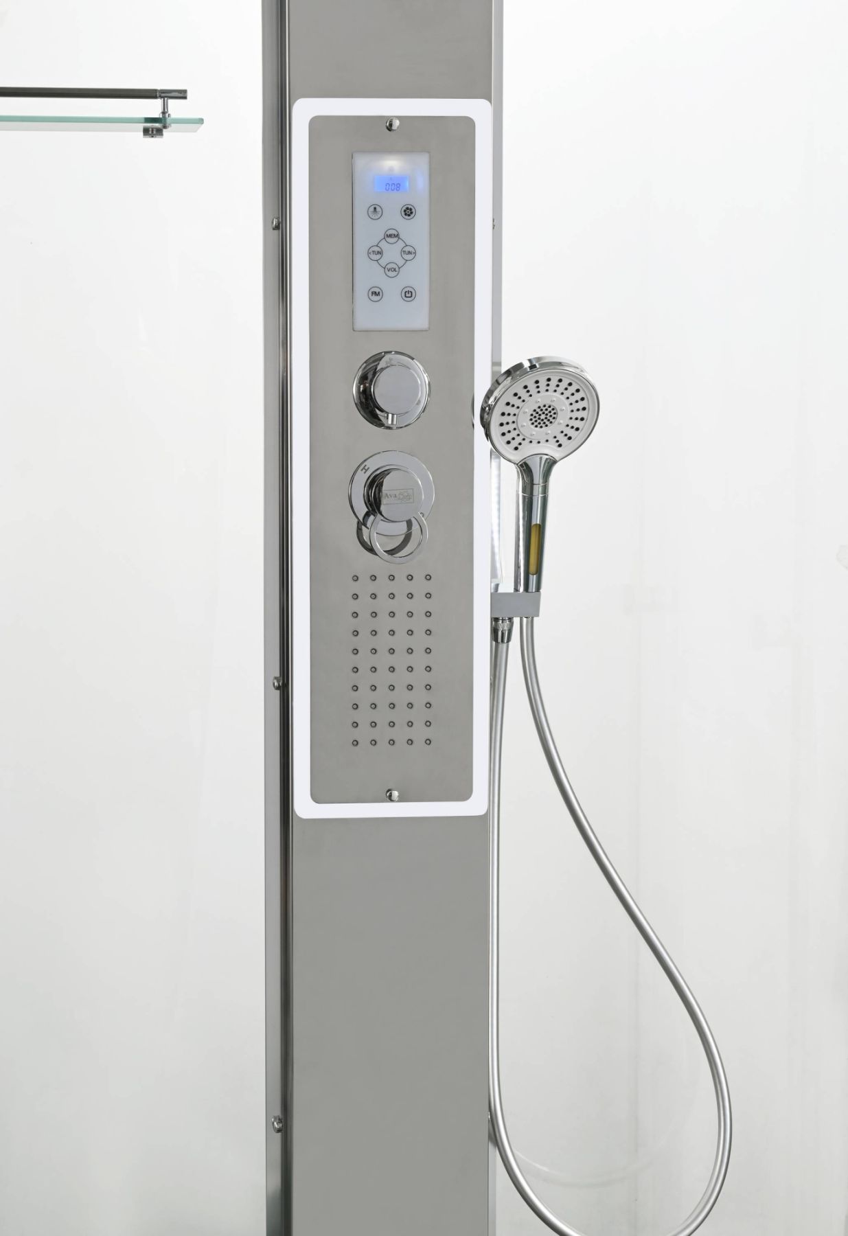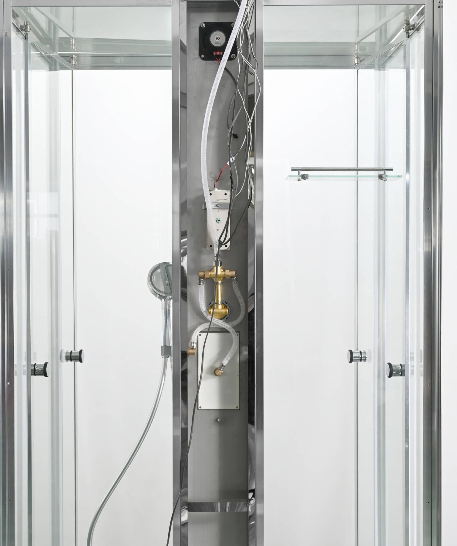 Стильная душевая кабина AvaCan сочетает в себе высокую функциональность, практичность и надежность. При изготовлении применяется безопасное закаленное стекло, надежно фиксируемое алюминиевым профилем.Профиль сделан из алюминия повышенной прочности. Сборка без силикона (увеличивает срок службы, защищает от протечек), внутренняя сборка (облегчает установку и ревизию; позволяет установить в ограниченном пространстве и обойтись без демонтажа других сантехнических приборов), смеситель резьбовой (без хомутов). Съемный экран поддона (позволяет осуществлять подключение и ревизию сифона).Двойные металлические ролики дверей (распределение нагрузки на два ролика, увеличивают срок службы). Душевая штанга(позволяет регулировать по высоте ручную лейку), ручная арома-лейка с витамином С (картридж в комплекте,есть возможность замены или удаления картриджа), полочки(из стекла, с ограничителем), сифон с гидрозатвором, сенсорный пульт управления с функциями: блютуз, LED подсветка, радио, вытяжка, гидромассаж спины, тропический (верхний) душ.