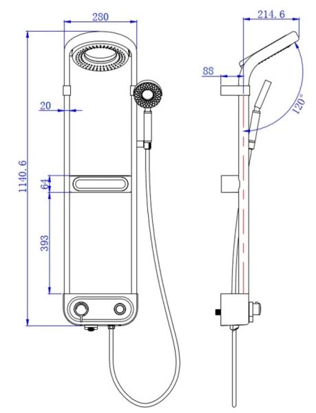 состоит из: верхний душ, ручной душ, термостат для душа, штанга для душа, держатель для душаверхний душ 210 2jetразмер душевого диска: 210 ммтип струи: Rainшарнирные соединения: регулируемый угол верхнего душа на 360 градусов (при переворачивании на 180 используется вторая струя верхнего душа)Душевая лейка: 3 струиС изливомдлина держателя для душа: 214.6 ммдержатель для ручного душа регулируемый по высотеповоротный держатель для душавид монтажа: внешний монтажсоединительная резьба G ½межосевое подключение 150 мм ± 12 ммИталия2 года гарантии