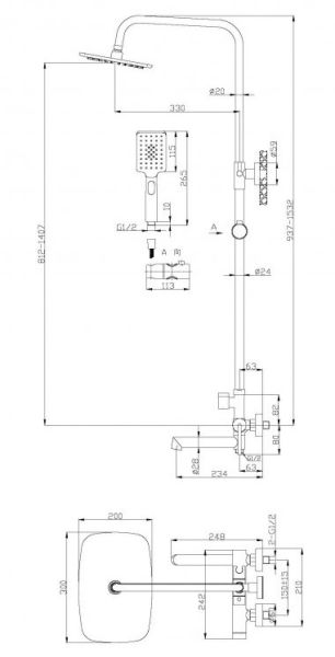 Дополнительная информация: регулируемая высота верхнего душа