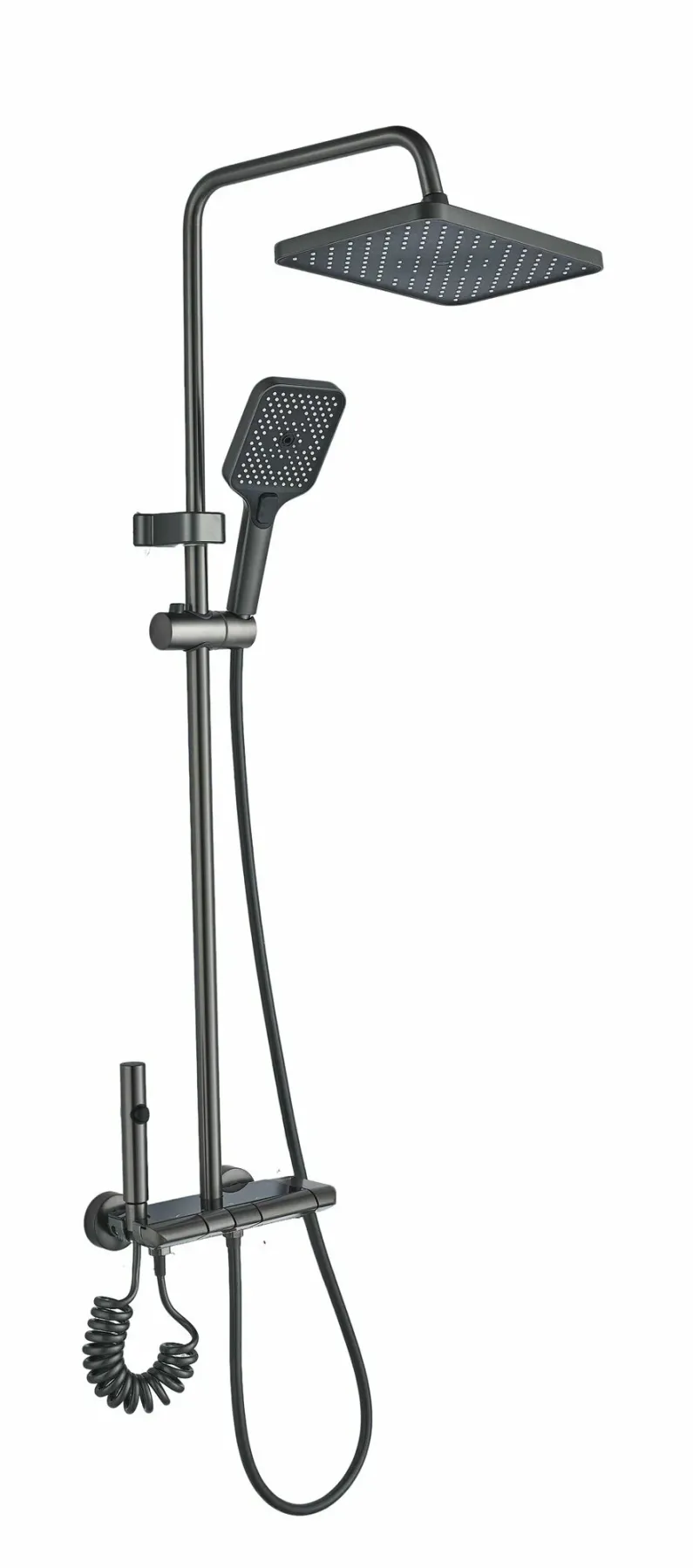 Система выполнена из прочной латуни с защитой от скручивания шланга, что гарантирует долговечность. Комплект включает верхний душ, лейку, шланг и смеситель — всё необходимое для создания полноценной душевой зоны.
