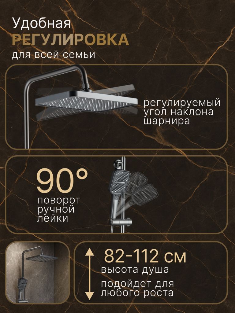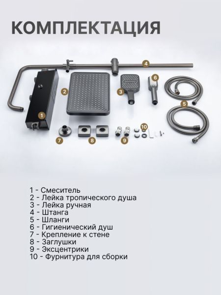 Душевой комплект содержит все необходимое для монтажа. Кроме того, наша душевая стойка с дисплеем и подсветкой имеет простой и быстрый монтаж, благодаря чему вы сможете установить ее самостоятельно без привлечения специалистов. Это позволит сэкономить время и деньги, а также получить удовольствие от процесса создания своего уютного уголка в ванной комнате.
