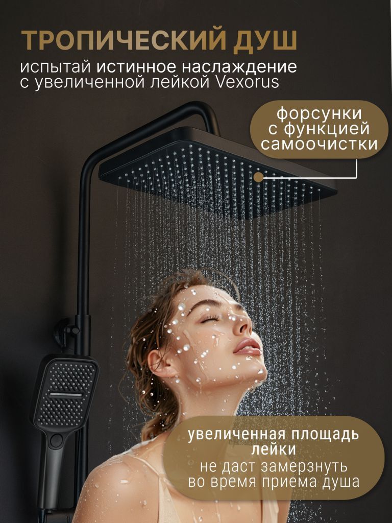 Душевая система с тропическим душем Vexorus - это система, которая превратит вашу ванную комнату в настоящий уголок роскоши и комфорта. Изделие выполнено в графитовом цвете, что позволяет гармонично его использовать в современном интерьере.