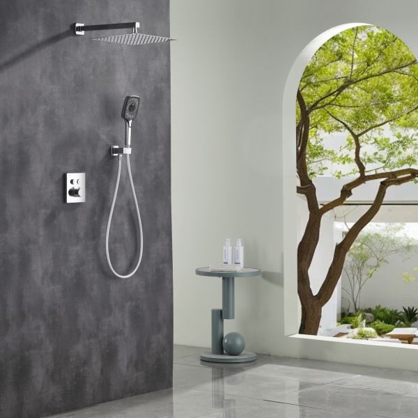 Готовое решение для душевой зоны скрытого монтажа датского производителя Black&White в цвете глянцевый хром. За управление давлением и температурой воды отвечает теромостатический смеситель постоянного потока , а для выбора режимов работы установлены две кнопки цилиндрической формы, расположенные в квадратном корпусе смесителя.Из потребителей доступен ручной душ с режимами , а также квадратная верхняя лейка на прямоугольном кронштейне. В дизайне изделия пересекаются квадратные и цилиндричсекие формы, которые гармонируют между собой создавая минималистичный облик, подходящий для большинства современных интерьеров