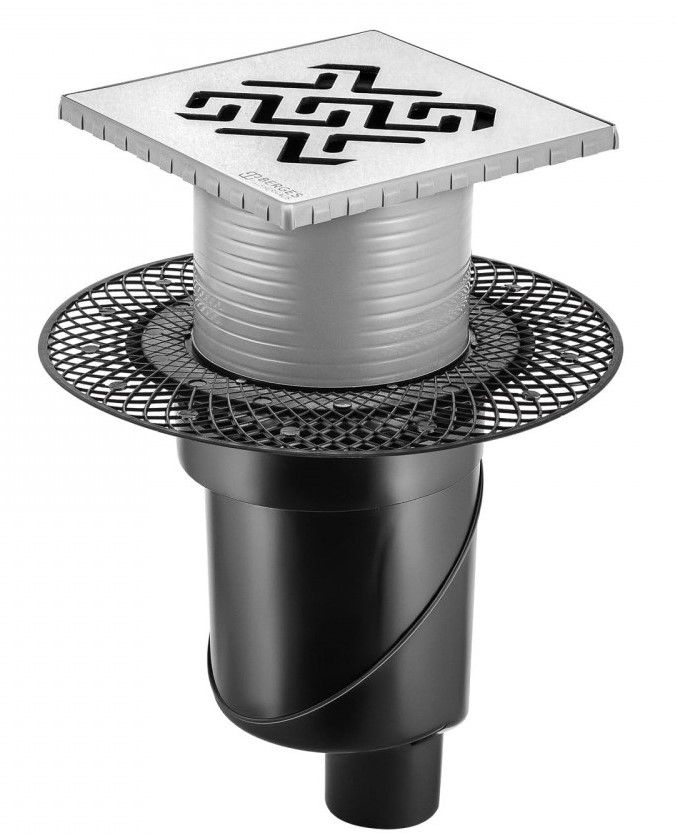 Решетка толщина 3мм, нержавеющая сталь AISI 304Горловина трапа, пластикФланец трапа с переходником, РРМонтажная заглушка, PPСамопромывной S-образный сифон PPВертикальный выпуск, пропускная способность 48л/мин, монтаж 360°Монтажный ключ, пластик