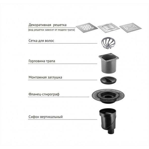 Решетка под плитку, нержавеющая сталь AISI 304Горловина трапа, пластикФланец трапа с переходником, РРМонтажная заглушка, PPСамопромывной S-образный сифон PP:вертикальный выпуск D50/105 H50, пропускная способность 48л/мин, монтаж 360°Монтажный ключ, пластик