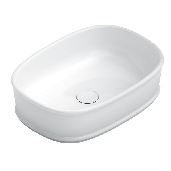 Белая глянцевая накладная раковина без отверстия под смеситель, ширина 50 см. Донный клапан в комплект не входит, рекомендованный донный клапан . Донный клапан конструктивно не закрывается полностью, так как у раковины отсутствует отверстие слив-перелив. Раковина устанавливается на столешницы, возможно использование со столешницами и тумбами