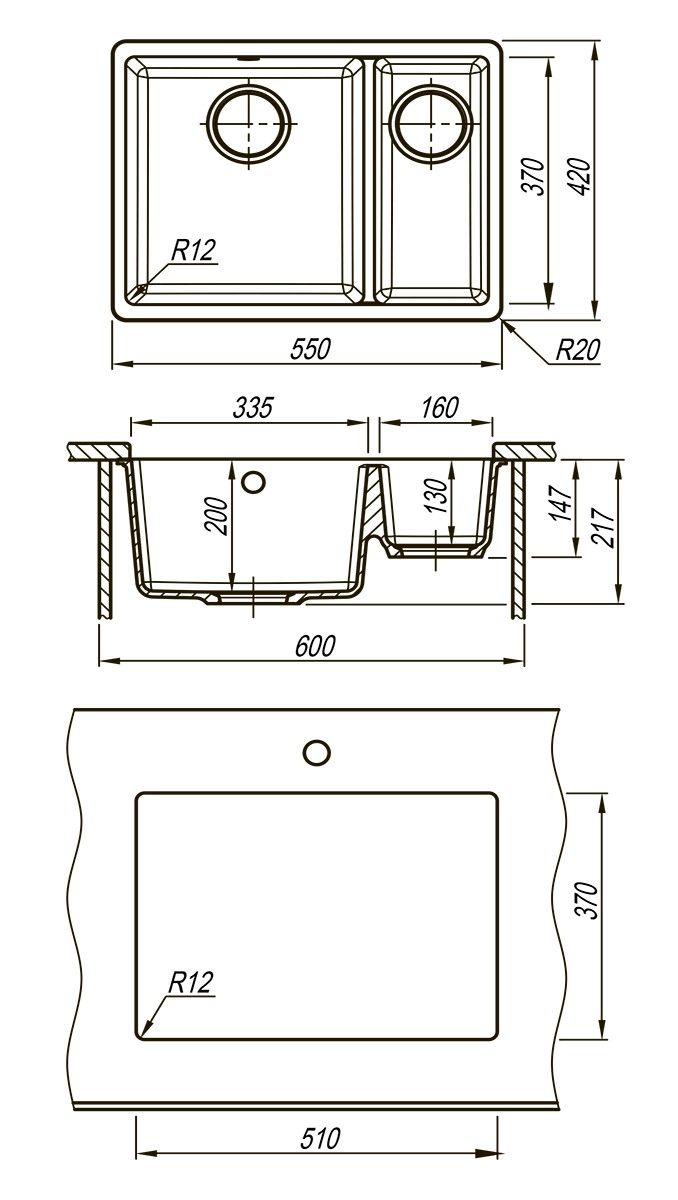 Имеет две прямоугольные чаши разных размеров, что позволяет расширить функции и оптимизировать процессы приготовления пищи и мытья посуды.