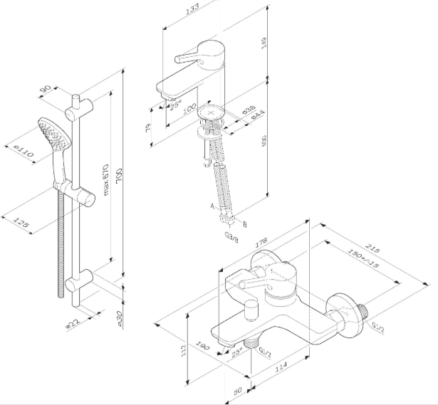 Состав душевого комплекта: ручной душ 110 мм, 1 режим, душевая штанга 700 мм с регулируемыми по высоте настенными креплениями, настенный держатель с возможностью регулировки угла наклона, душевой шланг 1750 мм с функцией защиты от скручивания twistless