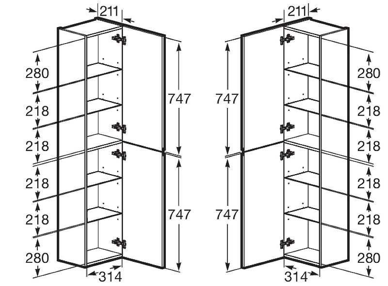 Дополняет комплект мебели OLETA шкаф-колонна в дизайне коллекции. Открытие фасадов осуществляется с помощью удобной профильной ручки. За фасадами, оснащенными петлями Hettich с плавным закрыванием, находятся регулируемые по высоте полочки из просветленного стекла.
