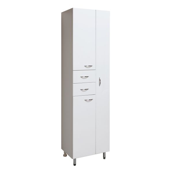 Шкаф-колонна напольный, справа - отделение для халатов с распашной дверью, слева -две дверцы и два выдвижных ящика. В нижнем и верхнем отделениях - по одной внутренней полке. Ящики - на шариковых направляющих, петли со встроенным доводчиком, ручки - 5шт, крючок - 1шт, ножки хром - 2 шт, ножки пластик -2шт. Выпускается только в правом исполнении