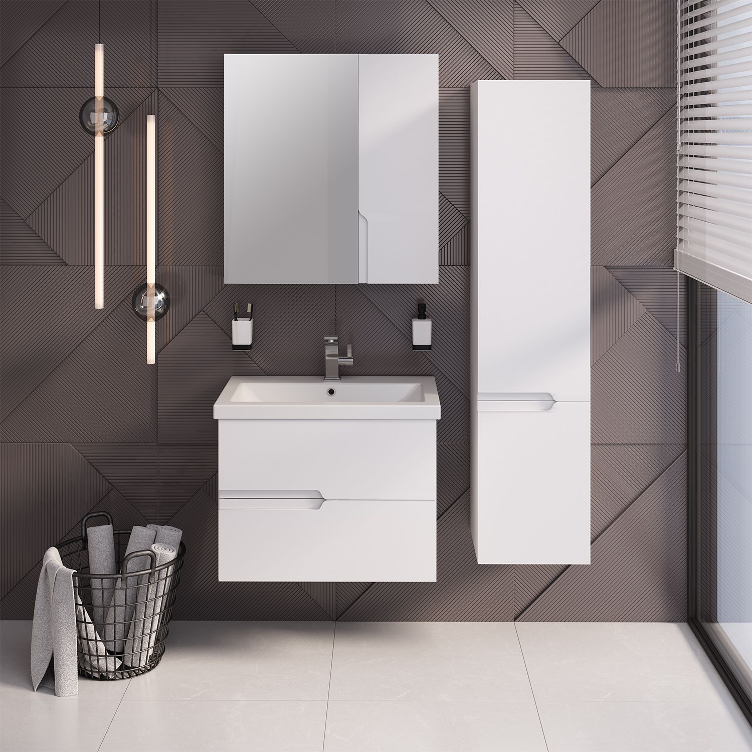 Шкаф-колонна подвесной с двумя отделениями и распашными дверками. В верхнем отделении - две встроенные полки, в нижнем - одна.  Выпускается только в правом исполнении.
