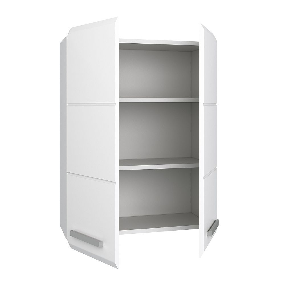 Шкаф навесной с двумя распашными дверками, за которыми две встроенные полки. Петли со встроенным доводчиком, ручки - 2шт, навесы 2шт.