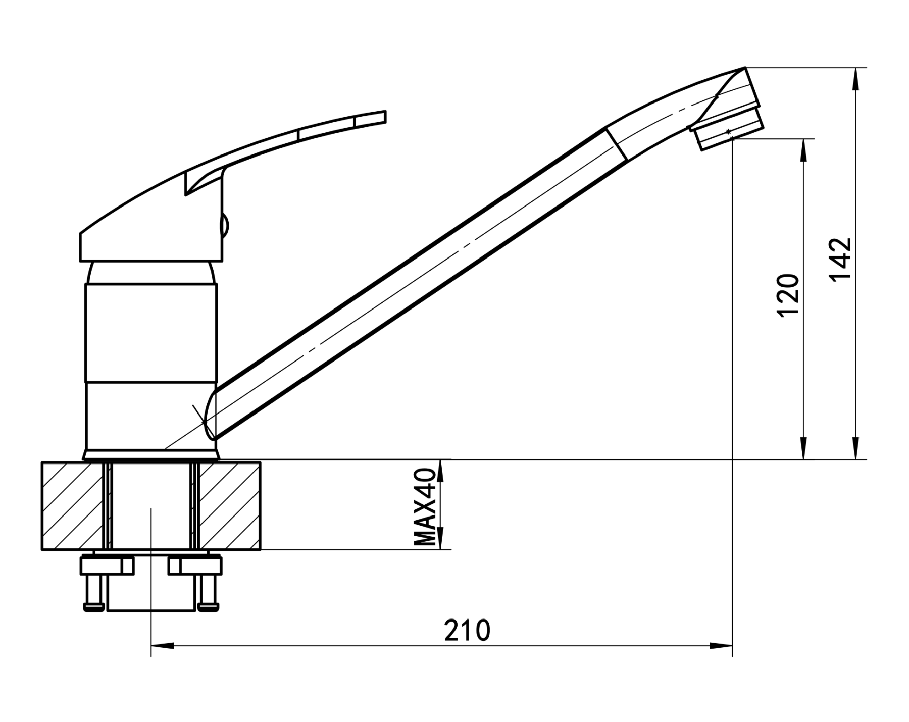 Смеситель однорычажныи? с низким изливомМатериал - материал корпуса латунь , материал излива нерж. стальПоворотныи? изливКерамическии? картридж 40ммГибкая подводка 50 см