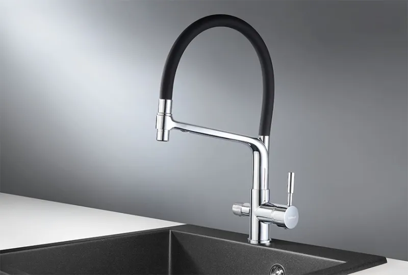 Смеситель для кухни. Цвет-хром. В комплект поставки входит: смеситель, гибкая подводка, комплект креплений, переходник для подключения фильтра с питьевой водой