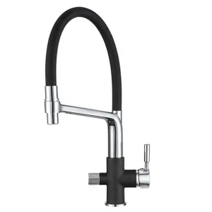 Смеситель для кухни. Цвет-черный. В комплект поставки входит: смеситель, гибкая подводка, комплект креплений, переходник для подключения фильтра с питьевой водой