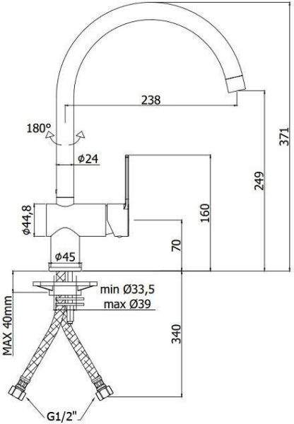 Смеситель для мойки с поворот.изливом, ХромСмеситель для кухни Paffoni Ringo RIN180CR.ВНИМАНИЕ! В монтажной схеме указан европейский стандарт подводки 3/8, мы предлагаем комплект, адаптированный к российским условиям, со стандартом подводки 1/2.Комплектация:
