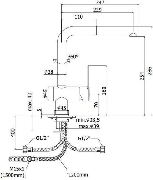 Смеситель для мойки с поворот.изливом и выдвижным 1 режим.душем из ABS, ХромСмеситель для кухни Paffoni Ringo RIN185CR.ВНИМАНИЕ! В монтажной схеме указан европейский стандарт подводки 3/8, мы предлагаем комплект, адаптированный к российским условиям, со стандартом подводки 1/2.Комплектация:
