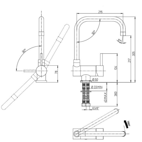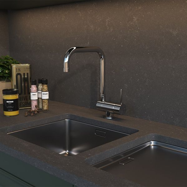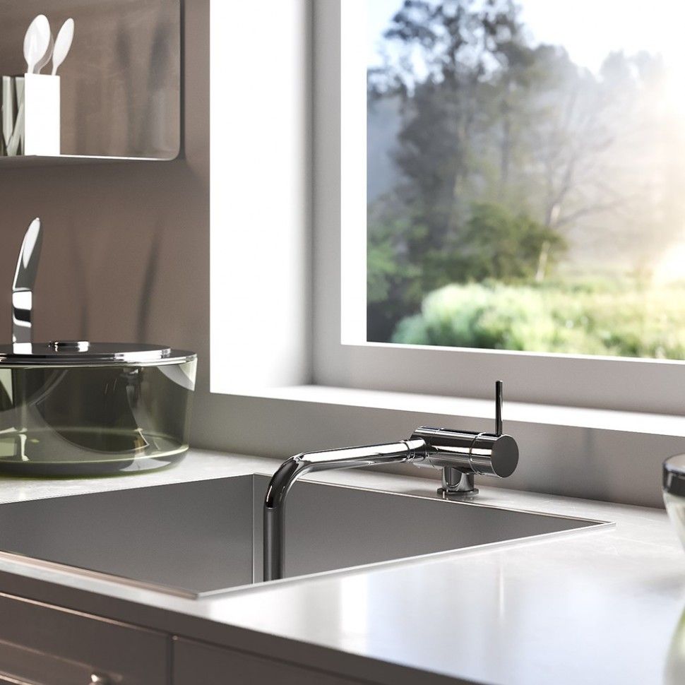 • Высокий корпус и поворотный излив дает больше возможностей при использовании на кухне.