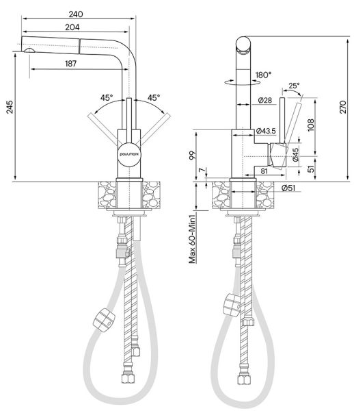 Смеситель для кухни с выдвижным шлангом, Ka214311-NIИзготовлен из высококачественной латуни, которая отвечает высочайшим европейским стандартам качества, не содержит свинца, не разрушается со временем и безопасна для здоровья.Вытяжной шланг