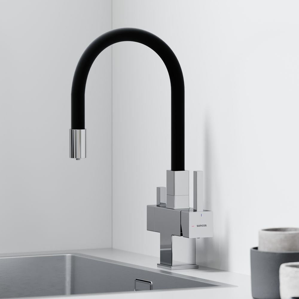 Смеситель для кухни SANCOS Arno с гибким изливом и возможностью подключения фильтра для воды, цвет хром, арт. SC4005CHФункция "Холодный старт" - при включении смесителя активируется холодной поток, для экономии горячей водыАэратор, гибкая подводка, ключ и крепления для монтажа