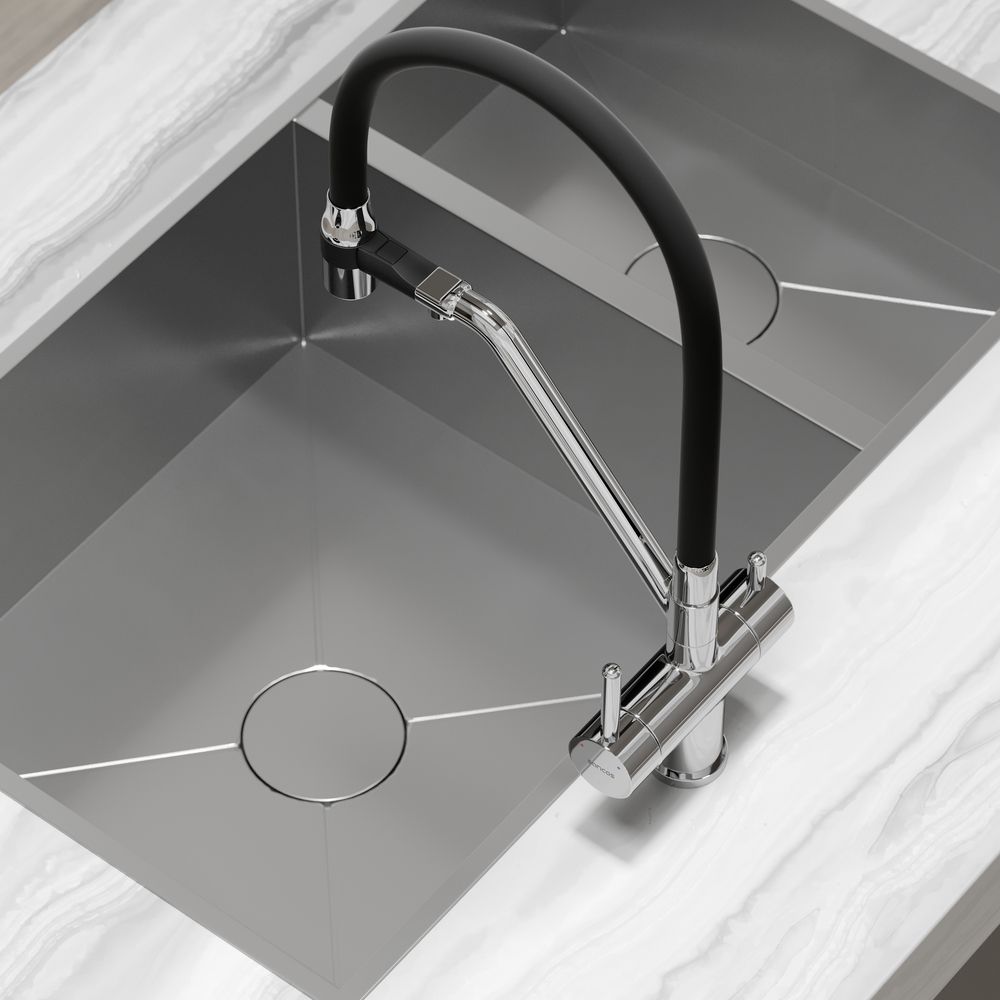 Смеситель для кухни SANCOS Dora с гибким изливом и возможностью подключения фильтра для воды, цвет хром, арт. SC4003CHС возможностью регулировки температуры водыАэратор, гибкая подводка, ключ и крепления для монтажа