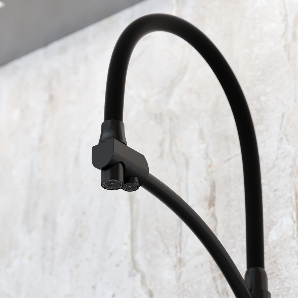 Смеситель для кухни SANCOS Eri с гибким изливом и возможностью подключения фильтра для воды, цвет матовый черный, арт. SC4001MBС возможностью регулировки температуры водыАэратор, гибкая подводка, ключ и крепления для монтажа, ключ для обслуживания аэратора