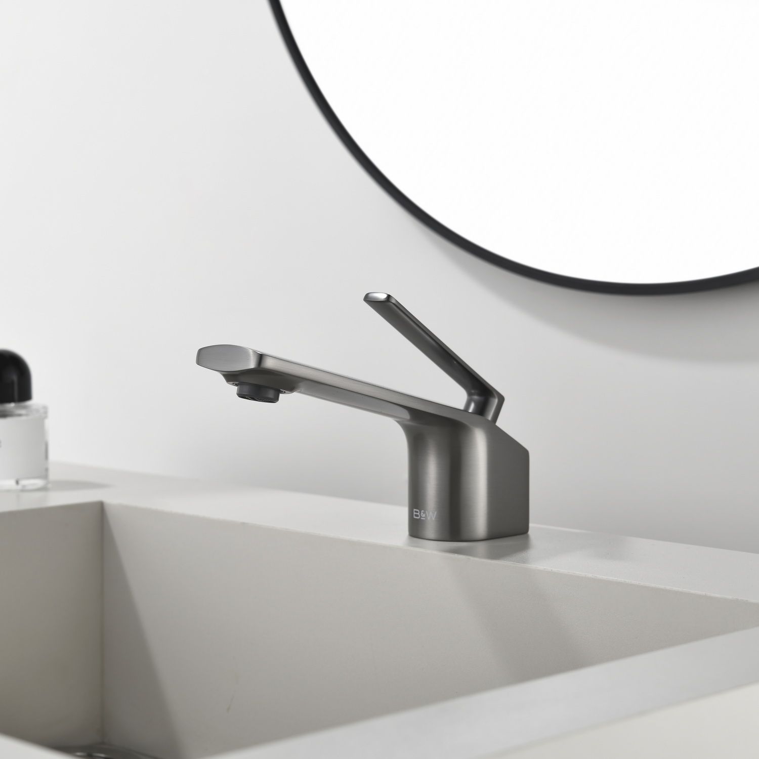 Смеситель для раковины датского производителя Black&White в цвете оружейная сталь. Продукт изготовлен из сантехнической латуни – безопасного для здоровья сплава,  обработанный PWD покрытием. Управление давлением и температурой воды происходит с помощью керамического картриджа повышенной пропускной способности. Низкий силуэт смесителя гармонично смотрится на раковинах с мягкими формами, а также минимизирует количество брызг, а излив с возвышением позволяет комфортно мыть руки.