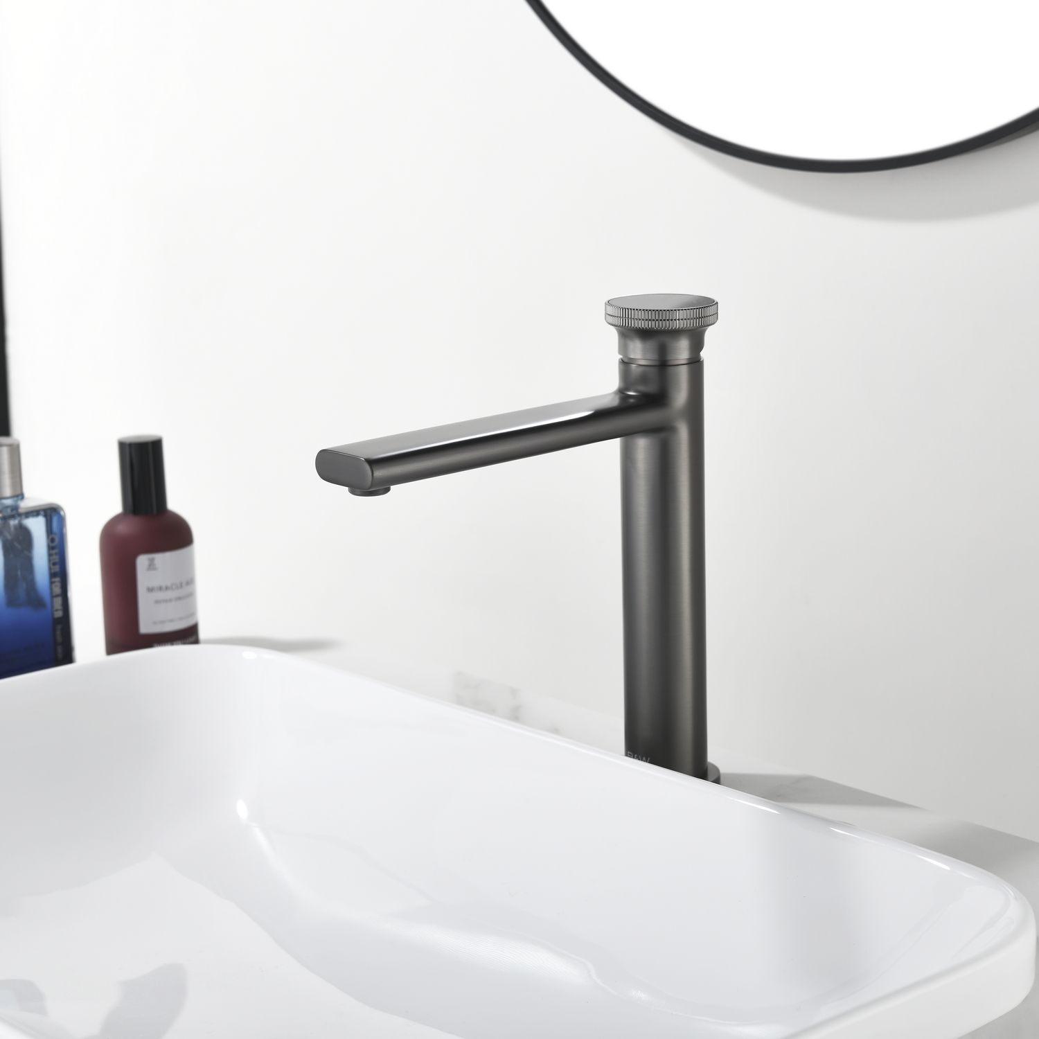 Смеситель для накладной раковины датского производителя Black&White в цвете оружейная сталь. Материал корпуса – сантехническая латунь марки HPB 59,безопасный для здоровья и высокоресурсный сплав.Для настройки температуры установлен керамический картридж прогрессивного типа– давление выдается постоянным , а температура выставляется с помощью круглой ручки с насечками расположенной сверху корпуса. В изделии пересекаются цилиндрические и прямоугольные формы, которые гармонично вольются в современные интерьеры ванных комнат.