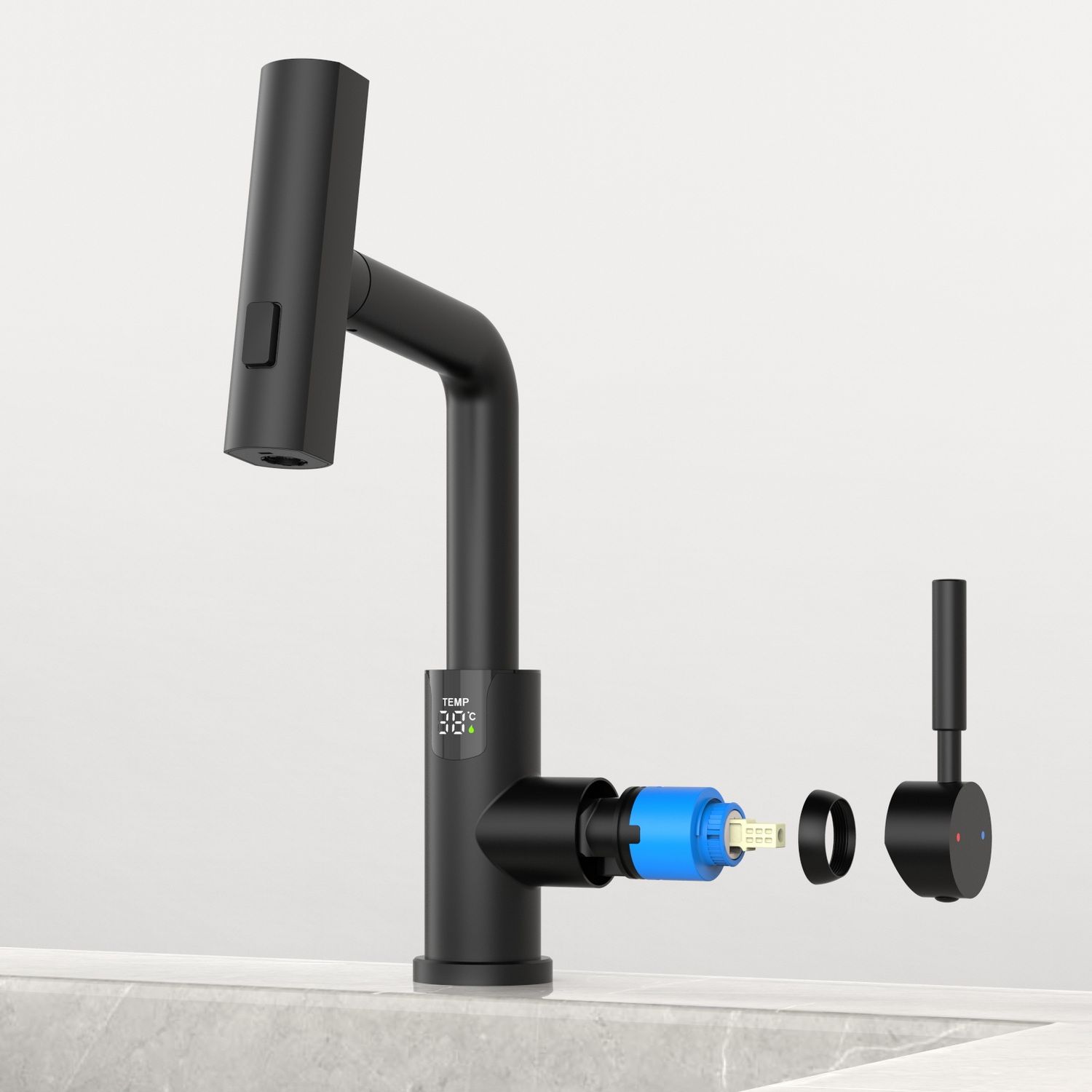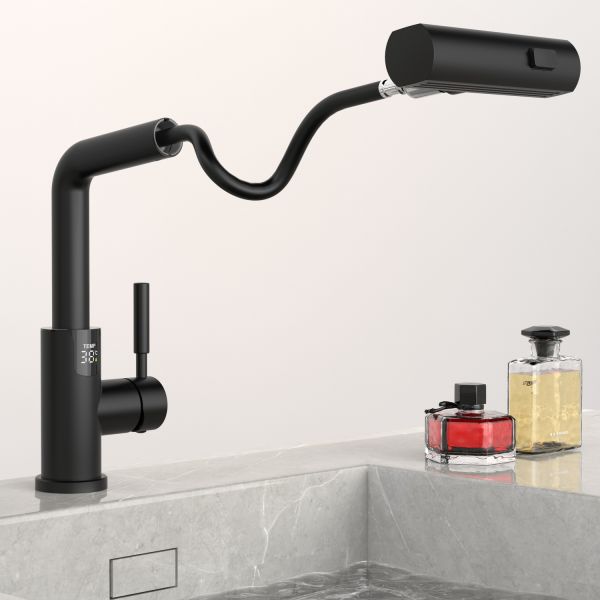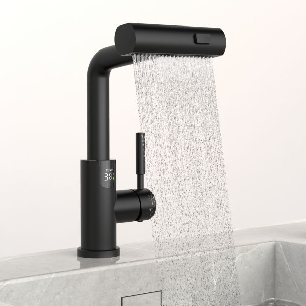 Смеситель для раковины датского производителя Black&White в черном матовом цвете. В корпусе изделия прослеживаются нотки классических форм и современного стиля. Изготавливается из сантехнической латуни для увеличенного запаса прочности и исключения вероятности появление коррозии. Управление потоком воды осуществляется с помощью керамического картриджа повышенной пропускной способности. Инновационным решением можно отметить электронное табло, расположенное в нижней части корпуса, на которое выводится показание температуры воды с подсветкой красного, зеленого и синего цвета. В данном продукте реализован многофункциональный излив с возможностью настройки высоты и длинны с помощью вытяжного шланга. Аэратор смесителя оборудован несколькими видами подачи воды, которые переключаются с помощью кнопки расположенной сверху корпуса.
