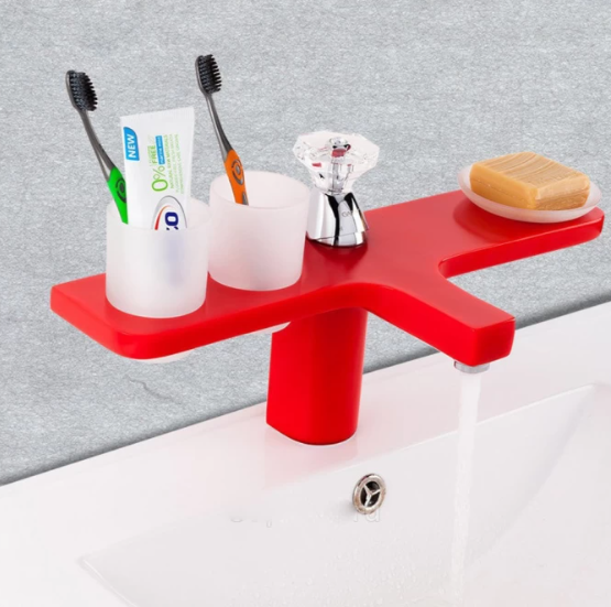 Смеситель для умывальника Gappo Giron G1096-7 — оригинальная однорычажная модель в комплекте с аксессуарами. Корпус выполнен в виде полочки, рычаг управления в форме кристалла расположен по центру. Модель изготовлена из латуни и кварцевого камня. В комплекте аксессуары для ванной комнаты: два стакана и мыльница. Цвет смесителя — красный.