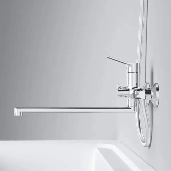 Универсальный длинный излив позволяет использовать смеситель как для ванны так и для рядом стоящей раковины. Поворотный переключатель с излива на ручной душ -максимум комфорта и надежности в использовании.