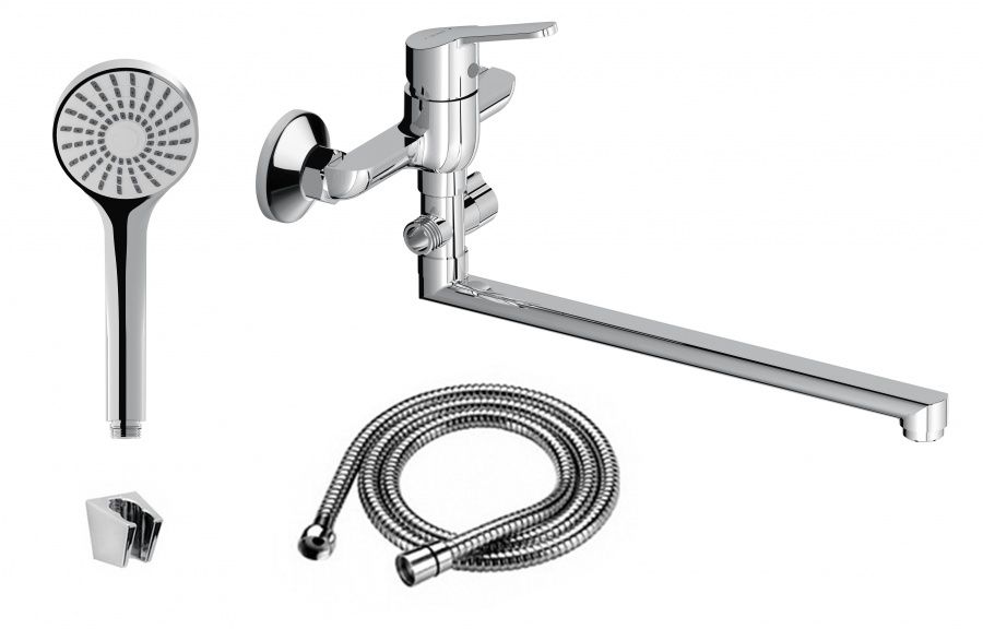 Смеситель для ванны и душа: излив поворотный, керамический картридж, в комплекте эксцентрики и декоративные розетки, душевой шланг 1500 мм, держатель (на два положения) и душевая лейка d 95 мм (1 режим).