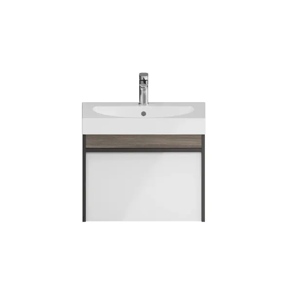 Мебель MODULA может быть использована для установки как мебельных раковин, так и любой из накладных, которые в этом случае устанавливаются на керамическую столешницу CANALETTO. Боковины тумбы выполнены в цвете «Арабика», фасад — белый глянцевый.