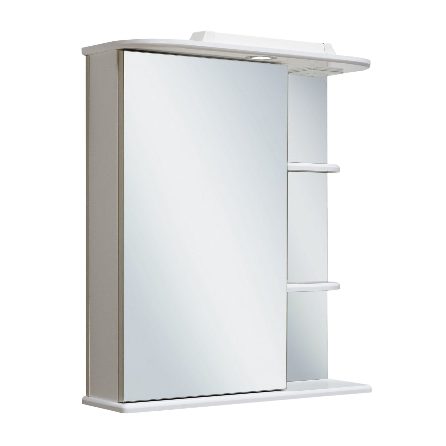 Зеркальный шкаф оборудован одним врезным светодиодным светильником 220В и розеткой с выключателем. Слева - шкаф с зеркальной дверцей и двумя внутренними полками, справа - две открытые полочки. Петли со встроенным доводчиком. Выпускается только в левом исполнении.