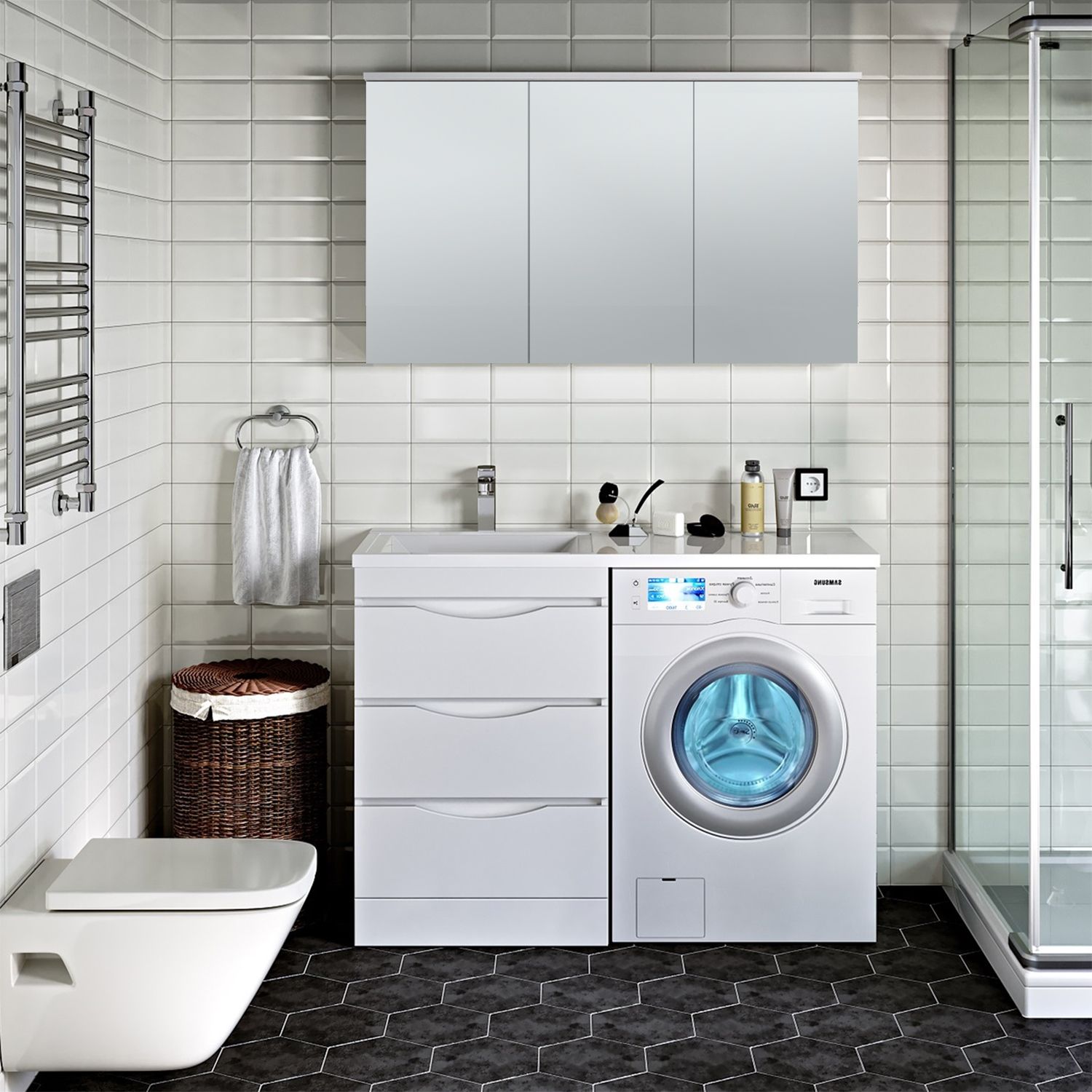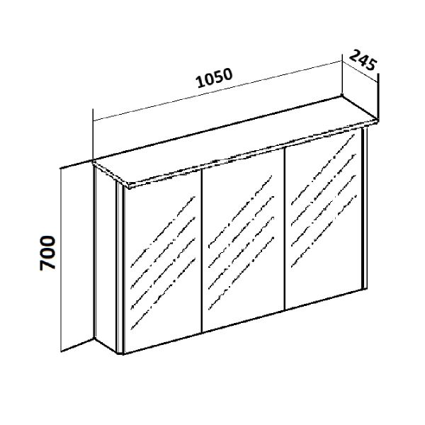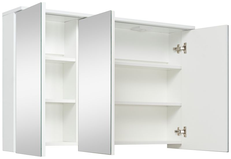 Зеркальный шкаф c тремя распашными зеркальными фасадами. Комплектуется светодиодной подсветкой, встроенной во врезной алюминиевый профиль, и розеткой с выключателем (внутри шкафа). Петли со встроенным доводчиком. Внутри каждого отделения шкафа по 2 встроенные полки.