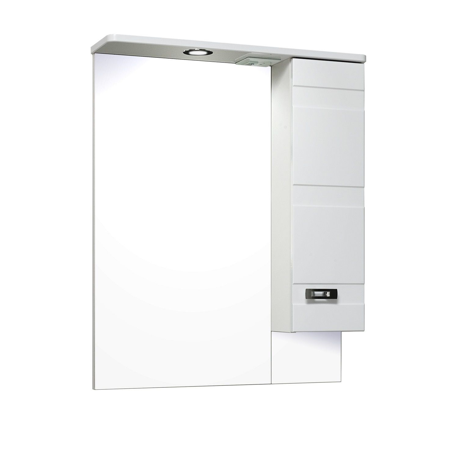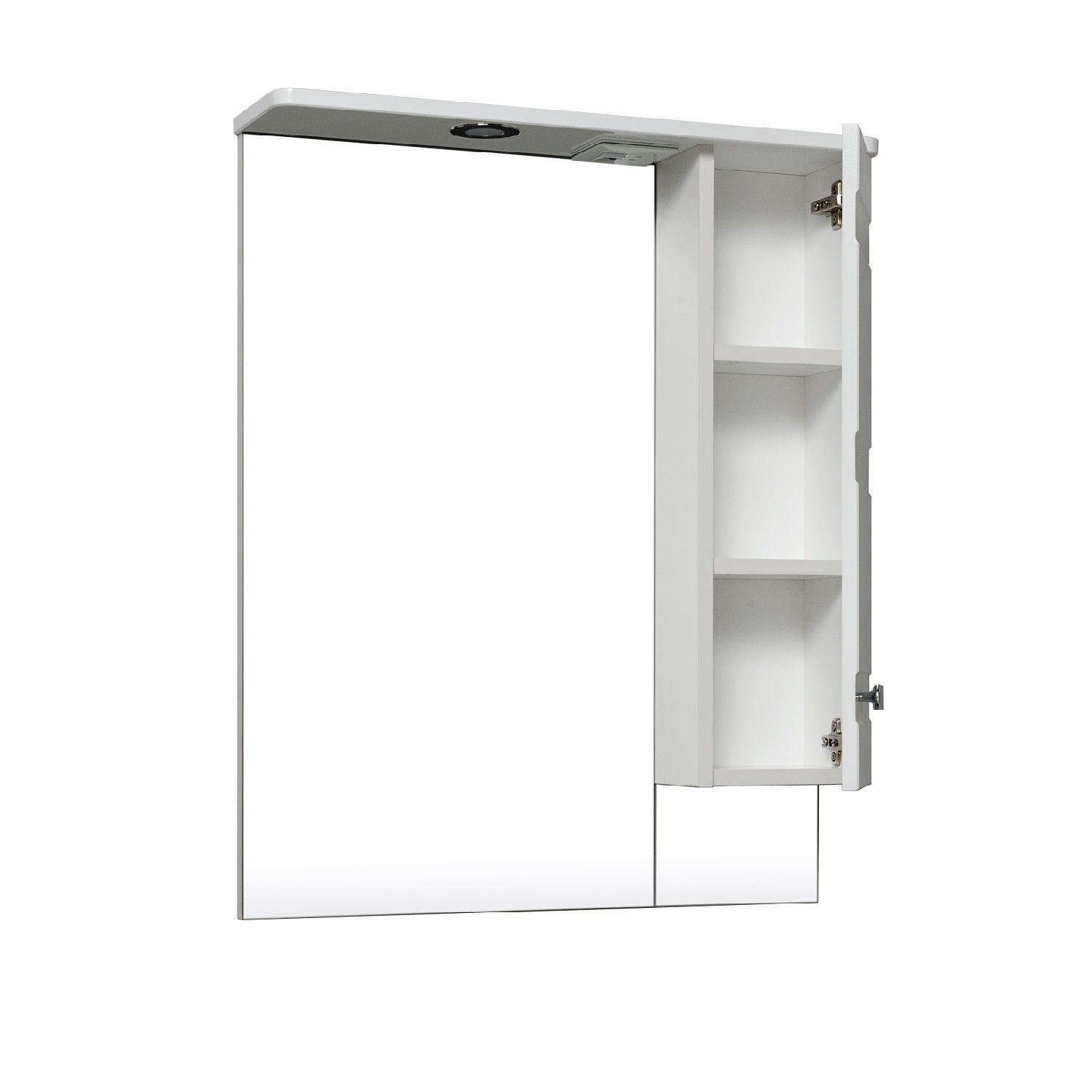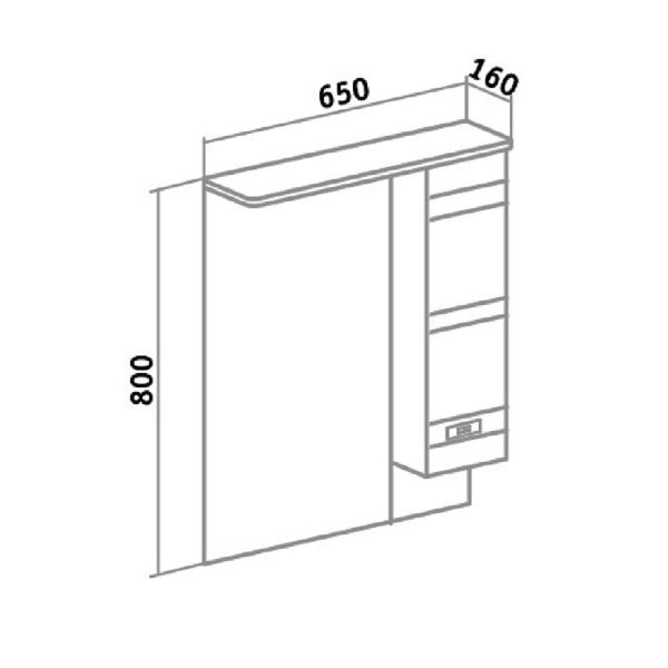 Зеркальный шкаф оборудован одним врезным светодиодным светильником 220В и розеткой с выключателем. Справа - шкафчик с распашной дверцей и одной внутренней полкой. Петли со встроенным доводчиком, ручка - 1шт. Выпускается только в правом исполнении.