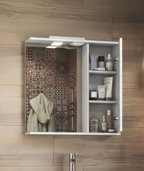 Оснащение: 1 дверца; 2 полки ЛДСП; ручка металлическая хромированная; 1 светодиодный светильник, включатель с розеткой